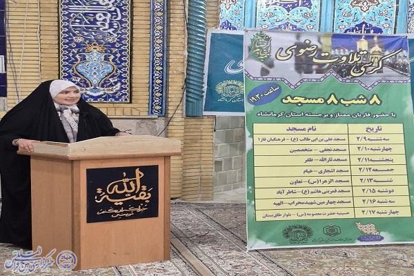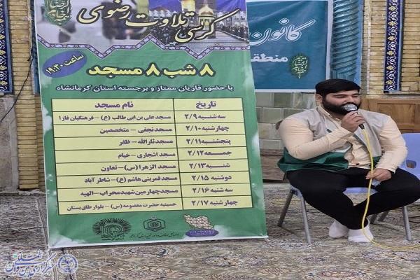همزمان با ایام پر برکت دهه کرامت کرسیهای تلاوت رضوی در سطح مساجد استان کرمانشاه با عنوان «۸ شب ۸ مسجد» درحال برگزار شدن است.